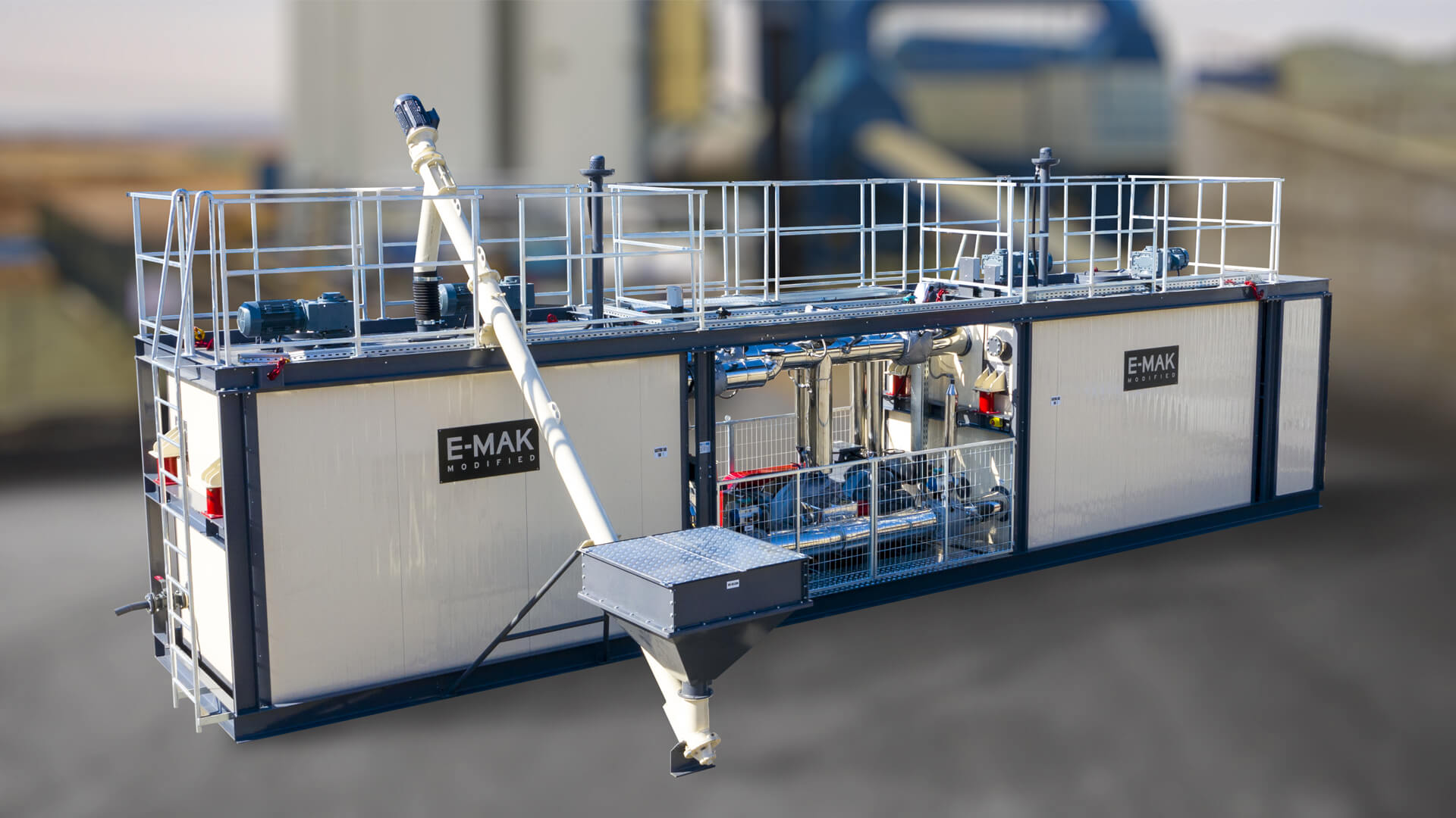 Produktionsanlagen für modifiziertes Bitumen der Serie “E-MAK PMB“ haben eine Kapazität von 15 Tonnen/Stunde und mahlen das Polymer (SBS, APP usw.) und Bitumen in einen homogenen Zustand.