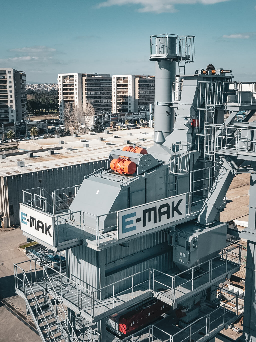 Vibrationsmotorsiebe mit horizontalen und vertikalen Schwingungen und reduzierter Neigung werden in E-MAK-Asphalt Planten mit hoher Kapazität verwendet, was die Gradationsfehlerraten minimiert.