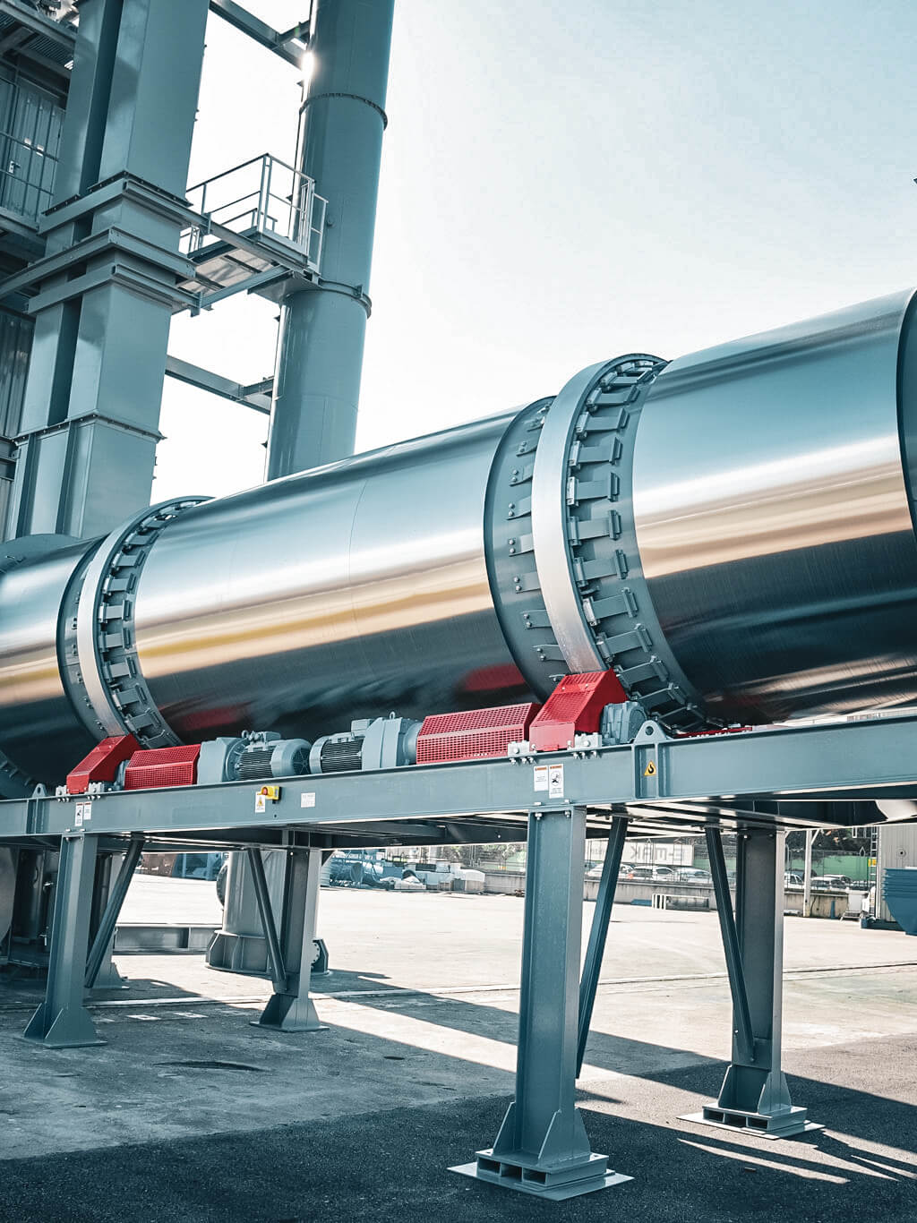 E-MAK dryers provide efficient aggregate drying and heating due to the specially designed angled shelves within the dryer with optimum heat transfer surface and minimum fuel consumption. The body and drive rings are held together with no welding (using bolts only) this avoids defects due to high and sudden temperature changes. The dryer is manufactured by material durable to wear and heat resistant. Dryer rings and rollers are made of special and long lasting forged steel