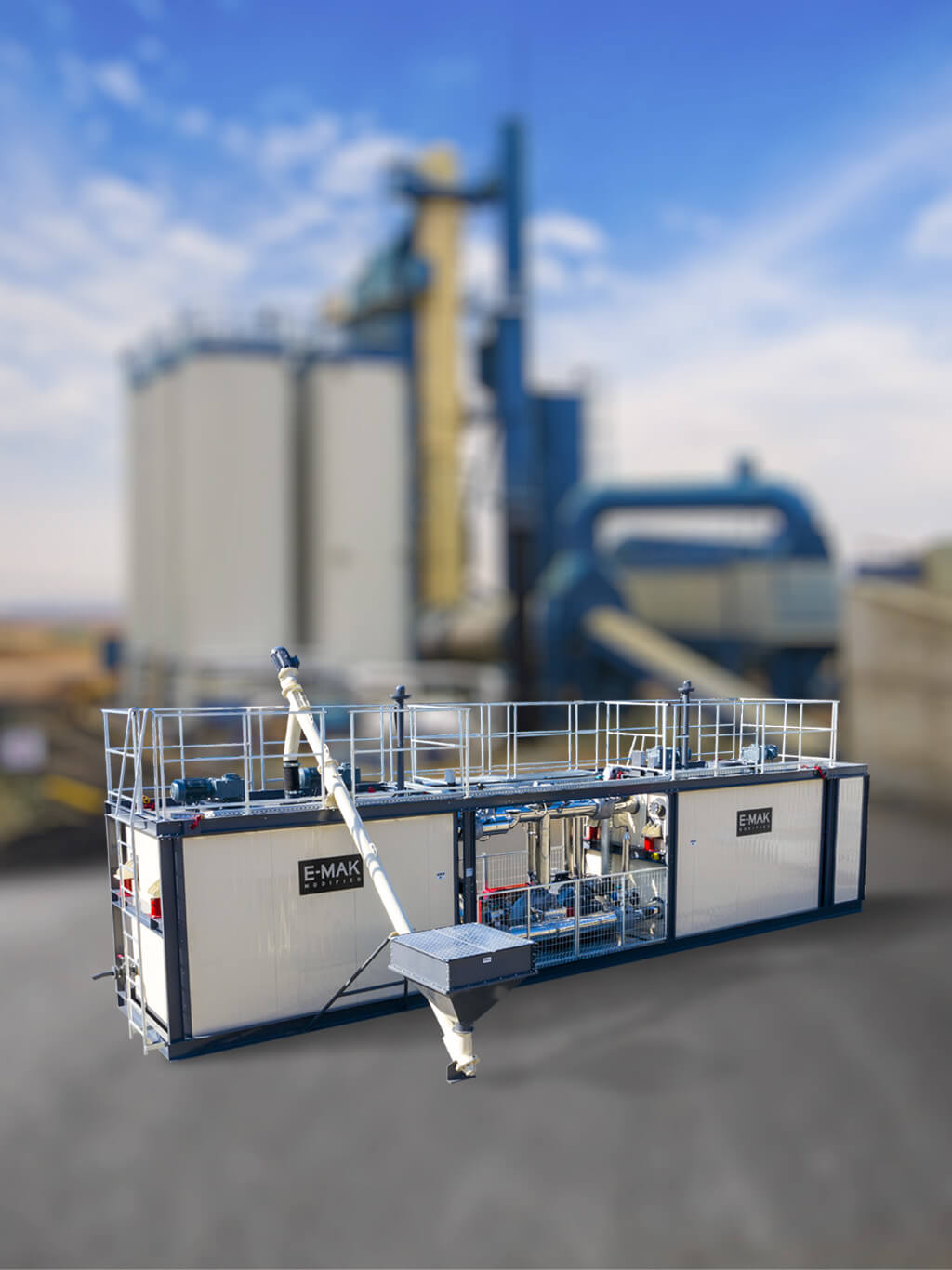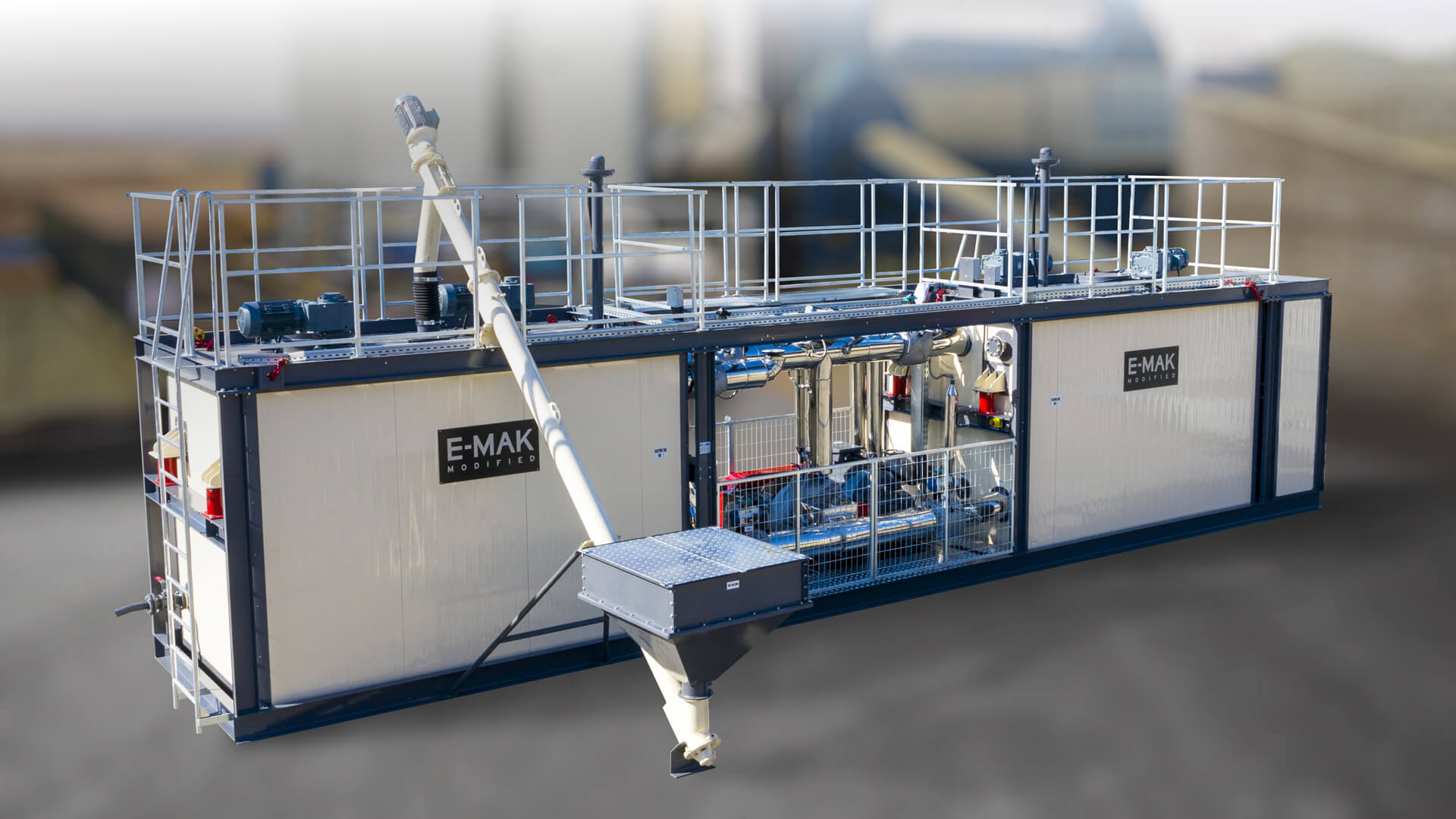 E-MAK PMB series modified bitumen production plants have a capacity of 15 tons/hour and they grind the polymer (SBS, APP, etc.) and bitumen into homogeneity.